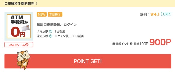 こちらは、「モッピー」で募集されている「ジャパンネット銀行」と「楽天銀行」の口座開設案件の例になります。それぞれ「1,100円相当」「900円相当」のポイントを獲得できます。