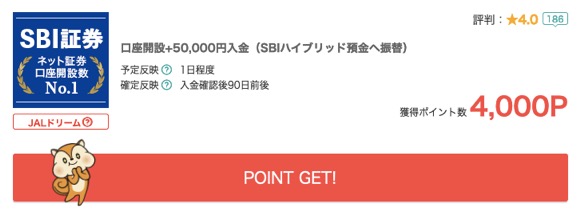続いてこちらは、「モッピー」で募集されている「SBI証券」の口座開設案件になります。口座開設に加えて50,000円の入金が必要になりますが、株式の取引をする必要はありませんので、こちらもノーリスクです。これだけで「4,000円相当」のポイントを獲得できるというのは、かなりのお得度ですね。