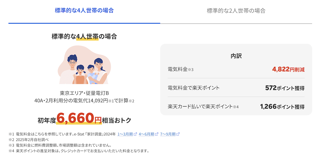 電気料金例はこちらになります。標準的な4人世帯で初年度6,660円相当がお得になるというシミュレーションになっています。
