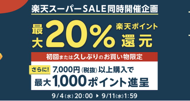 直近で実施されている、2024年9月4日20:00から9月11日01:59までの「楽天スーパーSALE」でも、楽天リーベイツ(Rebates)との連動企画として、「楽天ポイント還元最大20%」を実施しています。