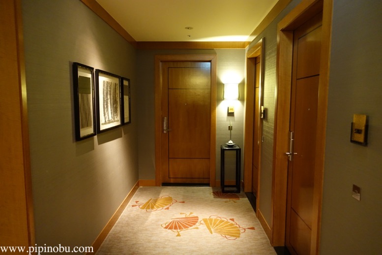 客室の扉を開けるとこんな感じになっています。ちょっとしたアプローチが設けられており、右手にミニバー、左手にバスルーム、奥にベッドルームという配置になっています。