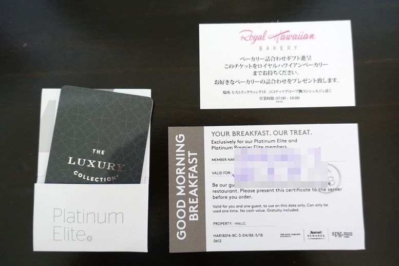 あとは、これはプラチナ特典ではありませんが、リゾートフィーとして提供されるサービスとして、ホテル内のベーカリーショップである「ロイヤルハワイアンベーカリー」の利用券をプレゼントしているということでした。
