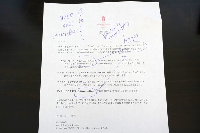 ロイヤルハワイアンの場合、チェックイン時にプラチナ特典の説明がありました。
