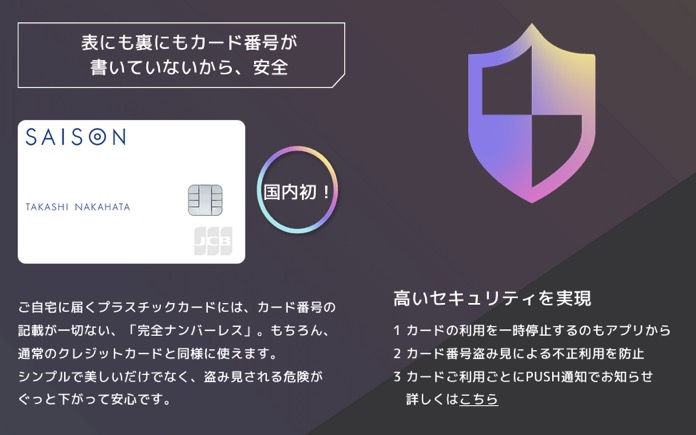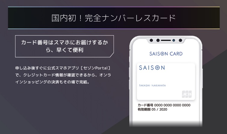 セゾンカードデジタル(SAISON CARD Digital )は、国内初の完全ナンバーレスカードとなっています。