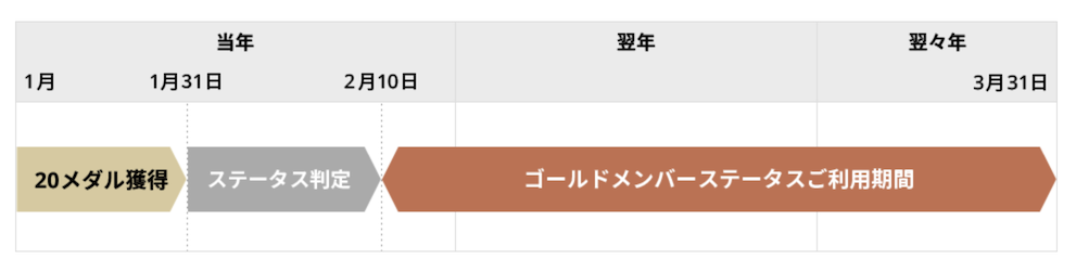 この1月1日から12月31日までのメダル獲得期間にステータス基準を満たした場合は、先行して翌月10日からステータスがアップし、ステータス特典を受けることができます。