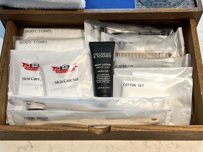 歯ブラシ、ボディータオル、ヘアブラシ、コットンセット、髭剃り、ボディローション、スキンケアセットなどが用意されています。