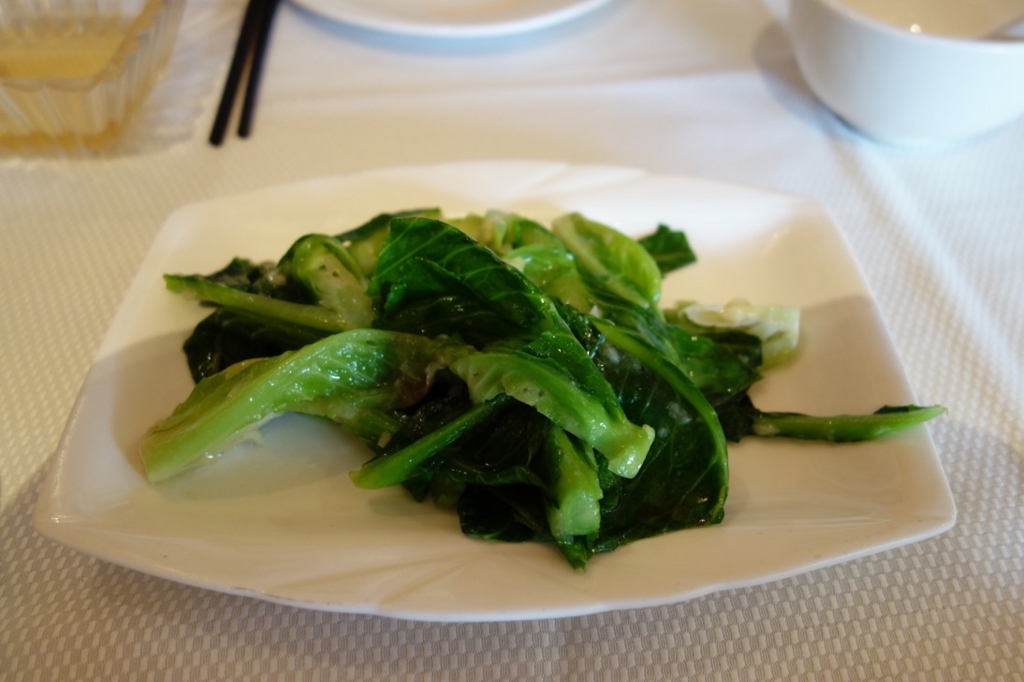 最初に運ばれてきたのは、前菜。カイランという中国野菜だそうです。ニンニクがたっぷり効いていて、なかなかのお味。