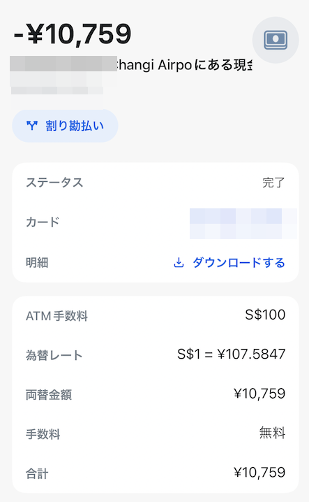 為替レートは「1シンガポールドル=107.58円」と他と比べて一番お得になっています。また、引き出した100シンガポールドル以外は手数料が徴収されていないことが確認できますね。
