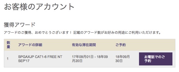 すると、こちらの画像のように「SPGAXJP CAT1-6 FREE NT SEP’17」というアワードを獲得できていることがわかります。