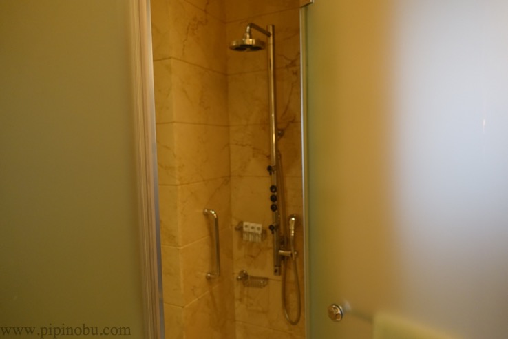 こちらはシャワーブース。シャワーはハンドシャワーとレインシャワーの両方が用意されています。また、ボディーマッサージ用のジェット吹き出しも用意されており、なかなか面白かったです。
