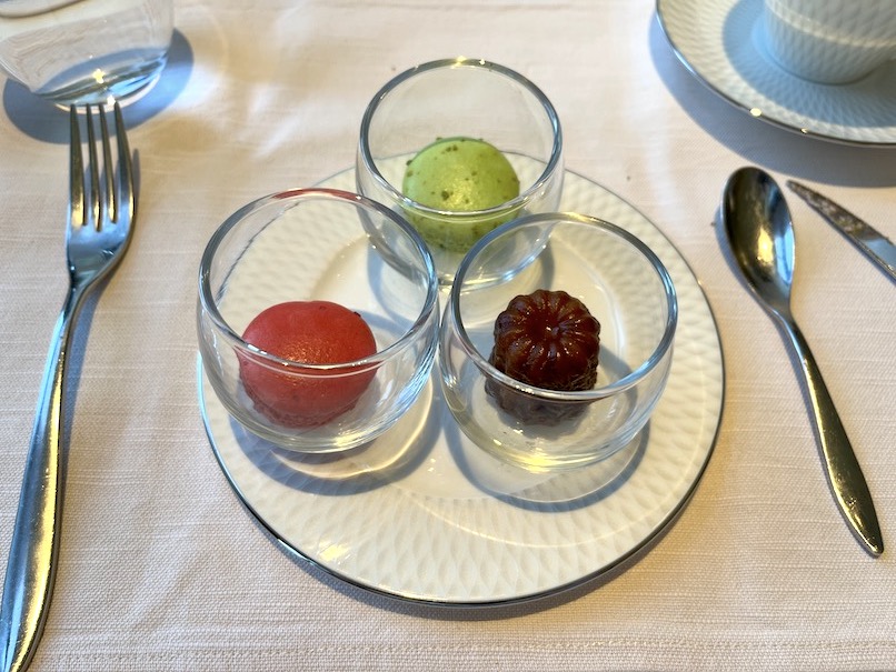 最後はデザートもいただきました。プリンとガナッシュ、お団子の3種類ですね。どれも美味しくいただきました。