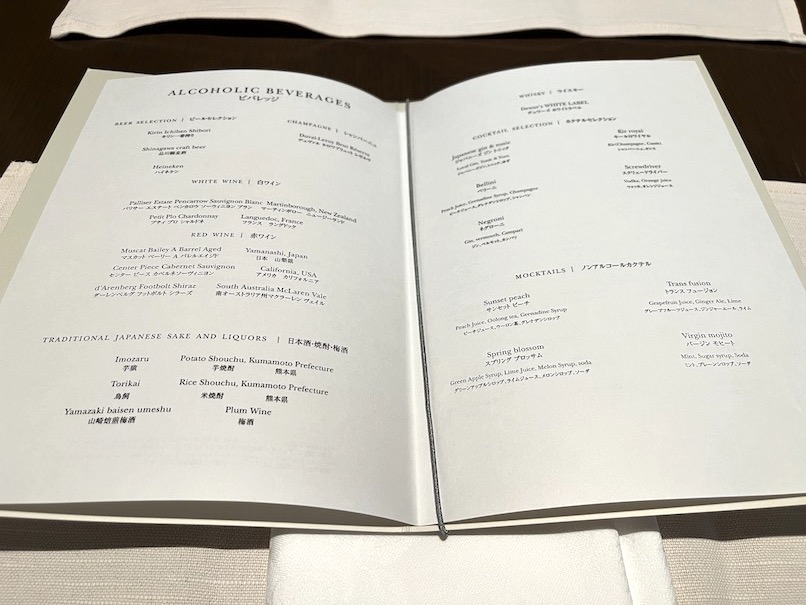 こちらはドリンクメニューです。左手にはシャンパン、ビール、赤ワイン、白ワイン、日本酒が記載されています。シャンパンこそ1種類ですが、それ以外はどれぞれ3種類ずつ用意されています。