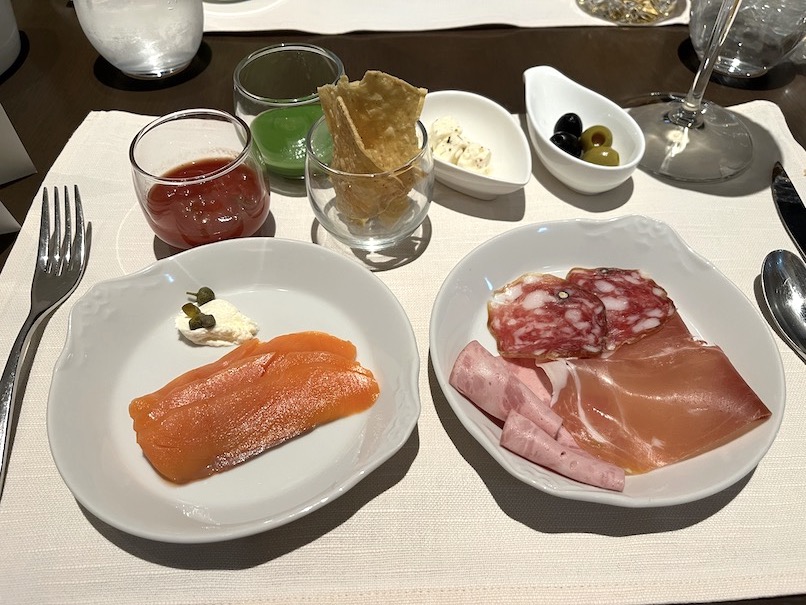 そんなこんなで、追加でいただいたカナッペはこちらになります。ハム類とサーモン、チーズ、チップス、などなど。どれもお酒好きにはたまらいラインナップですね。