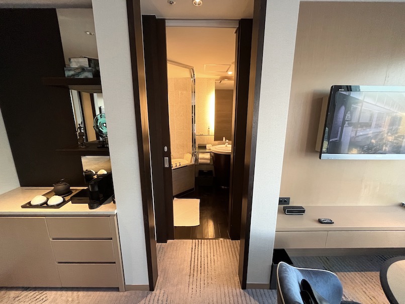 今回利用した客室は「クラブインターコンチネンタルルーム」となります。客室の扉を開けるとちょっとした玄関スペースがあり、左手にはミニバーとバスルーム、奥に進むと寝室という配置になっています。