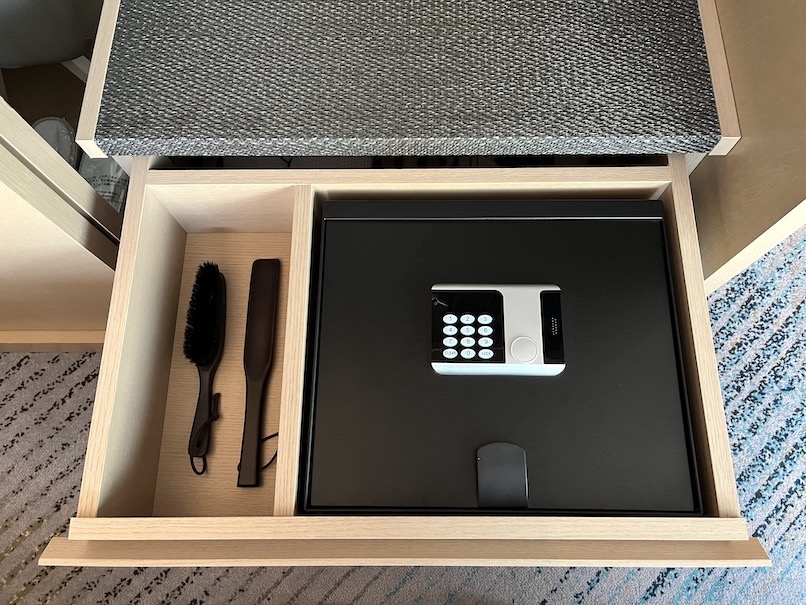 キャビネットの中には金庫とブラシ、靴べら、などなど。