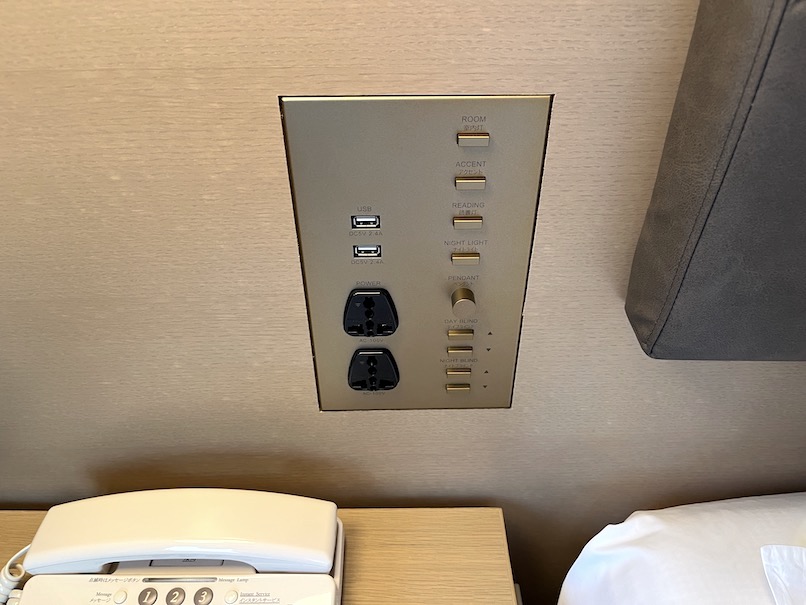 こちらはベッドサイドの用意されている電源&コントロールボタンですね。電源はUSBも用意されていて今時です。ブラインドはレースも遮光もボタン一つで開閉することができるようになっています。とても便利です。