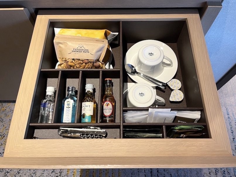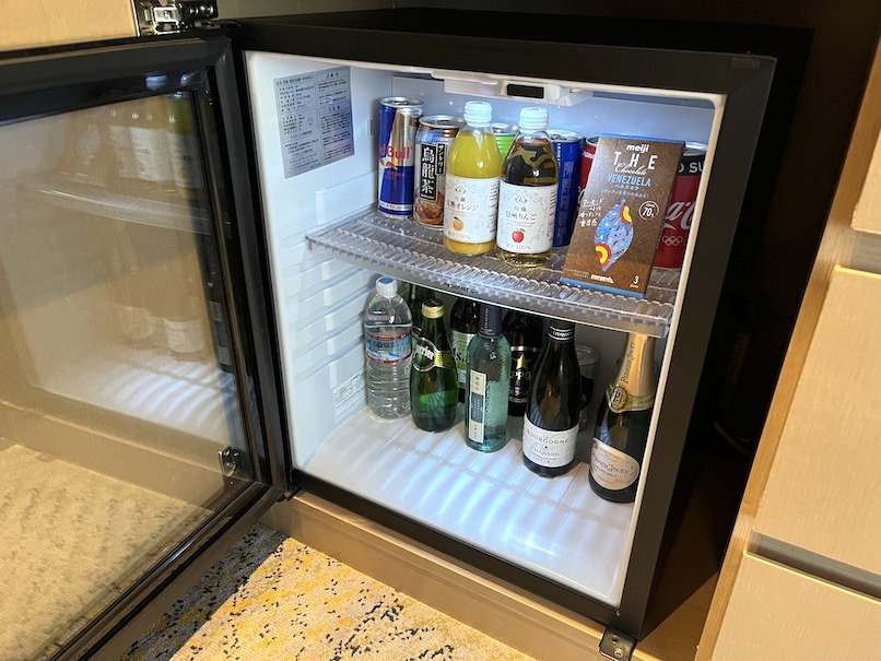 キャビネットの中には冷蔵庫が用意されています。あらかじめドリンクがぎっしりと収納されていますね。こちらは当然ながら有料のため利用の際はご注意ください。
