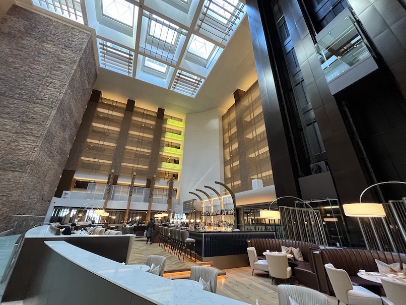 また、ロビーを奥に進むと天井がガラス張りとなったアトリウムに出くわします。こちらは最上階となる32階までが吹き抜けとなった空間で、明るく開放感抜群の空間となっています。天井の高さに圧倒されます。