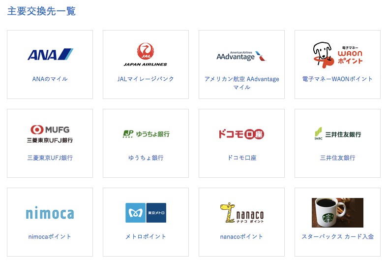 こちらは、「主要交換先一覧」になります。交換レートはよくありませんが、ANAやJALなどの航空会社のマイルへの直接交換にも対応しています。三菱東京UFJ銀行やゆうちょ銀行、三井住友銀行など、主要な銀行にも対応しているのがわかりますね。