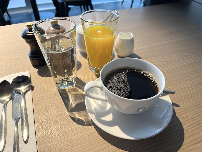 そんなこんなで、ここからは実際にいただいたものをご紹介していきたいと思います。こちらはオレンジジュースとコーヒーですね。