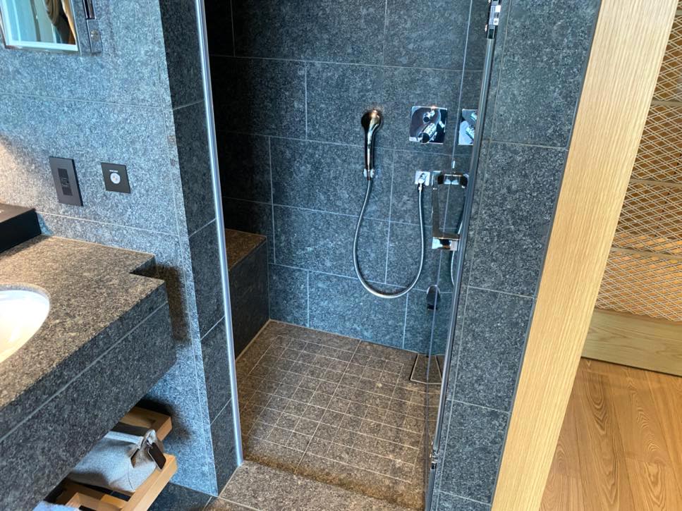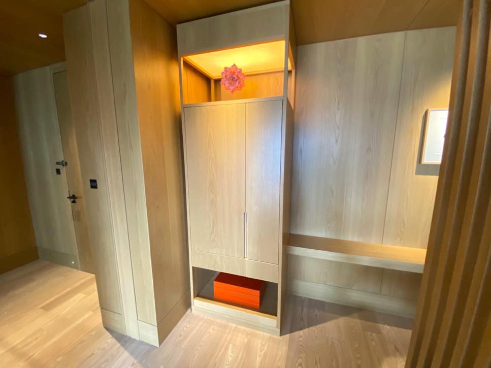 こちらの客室は「回遊型」になっており、扉を開けて右手側が「バスルーム」、左手側が「リビングルーム兼ベッドルーム」となっており、中央の「ウォーキングクローゼット」を起点に、ぐるっと1周できるようになっています。