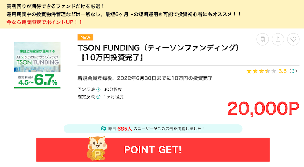 投資のためリスクはあるものの1案件で大量ポイントを獲得できるのは魅力的ですね。