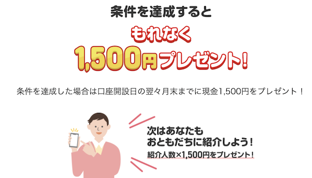 ちょとした一手間をかけるだけで1,500円がもらえるのはお得すぎますね。口座開設した後は自身が起点なって紹介することもできます。
