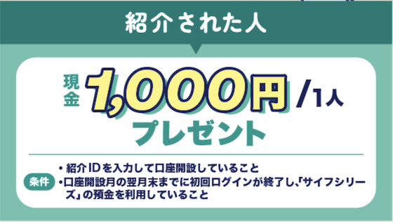 • 紹介IDを使用した口座開設、口座開設月の翌月末までに初回ログインが終了し、「サイフシリーズ」の預金を利用していることで現金1,000円プレゼント