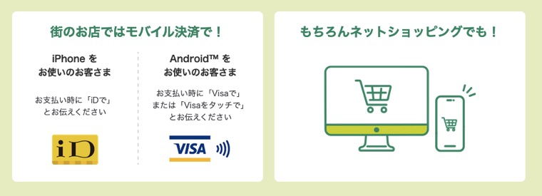 「ApplePay」や「GooglePay」の仕組みを利用しており、「iD」や「Visaタッチ」に対応している街のお店で、モバイル決済をすることができます。