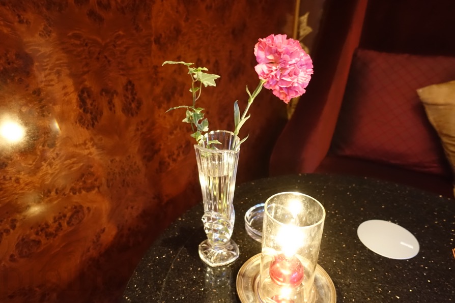 我々は、落ち着いたソファー席の方に案内されました。席の上には、こんな感じの生花とキャンドルが置かれています。とっても素敵です。