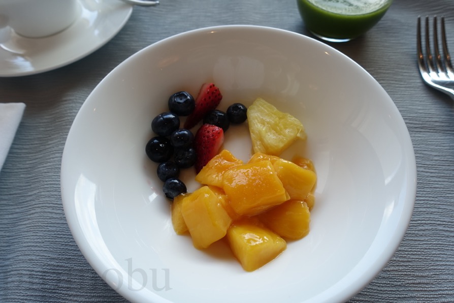 そんなこんなで、クラブラウンジの朝食サービスでいただいたものはこちらのフルーツの盛り合わせになります。私が特に好きなブルーベリーとイチゴ、マンゴーに絞っていただきました。