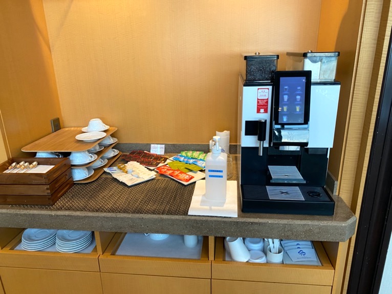 ホットドリンクについては、隣のカウンターに用意されています。コーヒーは専用のマシンが用意されており、普通のコーヒーやカフェラテなど、ボタン一つで好みのものをいただけるようになっています。コーヒー豆から挽いて淹れてくれるタイプで、味もなかなかでした。