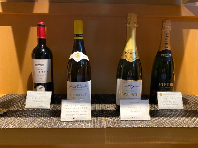 用意されていたのはこちらの4種類です。ボルドーの赤ワイン、ブルゴーニュの白ワイン、フランス産のスパークリングワインに加えて、ノンアルコールのスパークリングワインも用意されています。