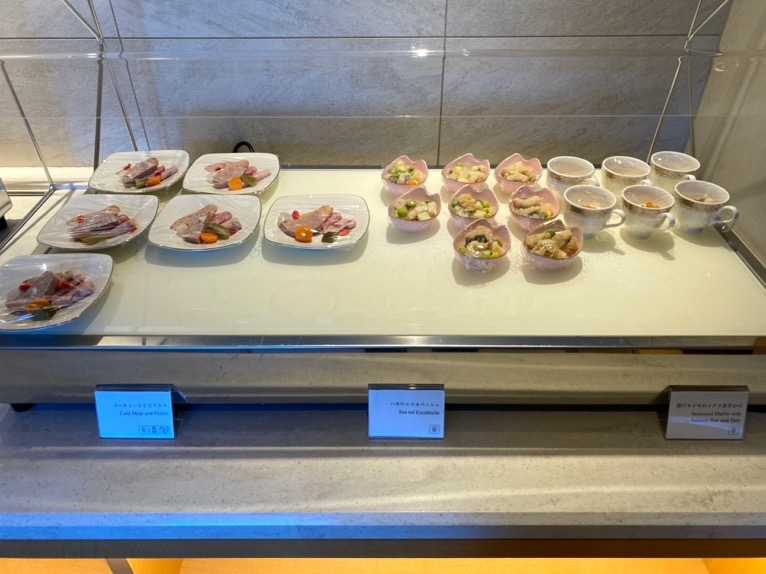 ラウンジの一角にはビュッフェカウンターが用意されており、こちらには時間帯に応じたフードが用意されます。また、後でご紹介するドリンクカウンターも用意されており、ドリンクもいただくことができます。どちらもセルフサービスになっており、自分で好きなものを好きなだけいただけるようになっていました。