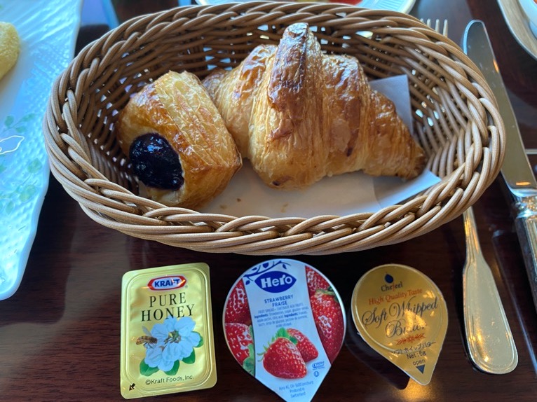パンについては、クロワッサンやデニッシュ、トースト、メロンパンなどがセットになったバスケットが、何種類か用意されていました。はみちつやジャムなどの用意もありますね。