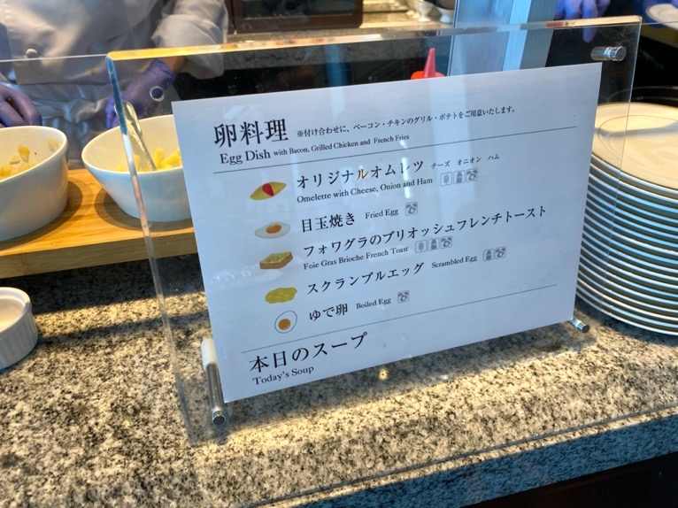 朝食の時間になると、ラウンジ内にエッグステーションが設けられます。こちらでは、目の前でシェフが出来立ての卵料理を調理して提供いただくことができます。朝食ならではの醍醐味ですね。
